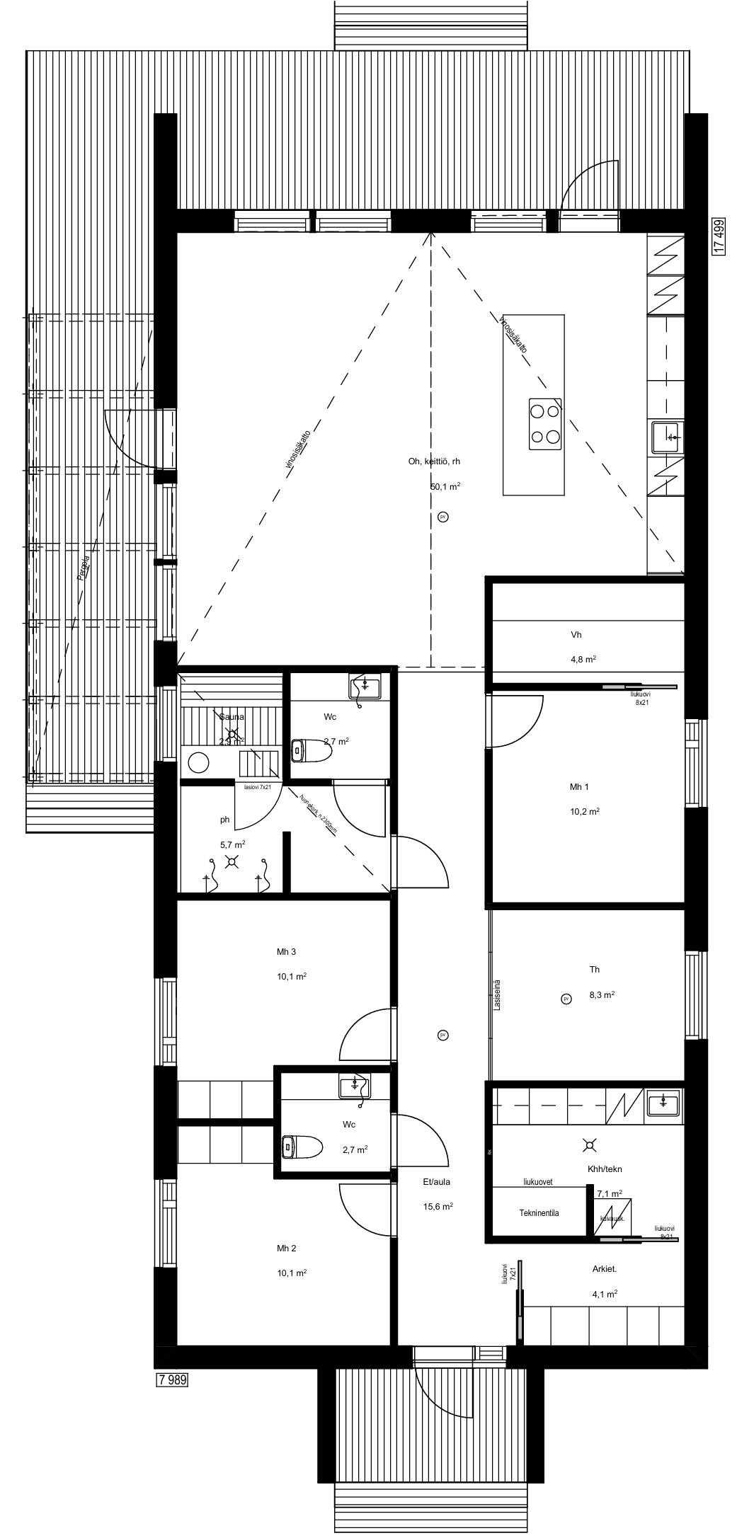 Oleskelutilat ovat kodin näyttävin kokonaisuus. Korkea, jopa kuuden metrin huonekorkeus ja vinosisäkatto luovat henkeäsalpaavan tilan tunnun. Suuri päätyyn suunniteltu lasiseinä tuo luonnon osaksi sisätilaa, ja vinot ikkunalinjat viimeistelevät arkkitehtonisen ilmeen. Valo elää tilassa päivän mittaan ja korostaa sen ainutlaatuista mittakaavaa. Saarekkeellinen keittiö nivoo oleskelutilat yhteen ja toimii kodin luontevana kohtaamispaikkana.